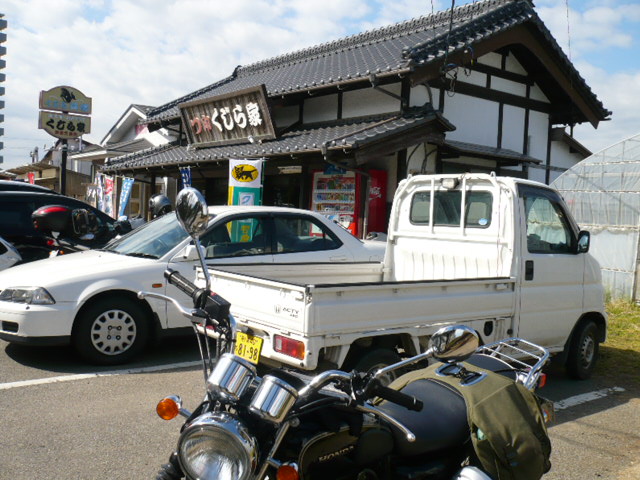 勝浦から鴨川を越えて南房総市に入り、そろそろこのへんだよなーとか思いながら走ってたら、国道128号の右側に「くじら家」の看板が見えて来た。俺は対抗車が途切れるのを待って反対車線を横切り、くじら家の駐車場にCB400SSを入れた。思っていたよりも、随分とこじんまりした店だ。