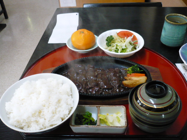 ぼけーっと待ってたら10分ほどで料理が運ばれて来た。熱い鉄板に乗せられた鯨のステーキがじゅうじゅうと音を立てて湯気を上げ、ソースが鉄板で焼ける香ばしい香りがなんとも食欲をそそる。デザートのみかん丸ごと一個が微笑ましい。そしてご飯の盛りが結構なボリュームだ。俺の後から入って来たおじさんが、俺に運ばれてきたご飯の盛りを見て、店の人に「すみませーん。ご飯半分にしてくれる?」って言ってた。